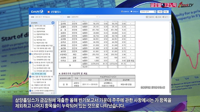 삼양홀딩스가 금감원에 제출한 올해 반기보고서 가운데 주주에 관한 사항에서는 가 항목을 제외하고 나머지 항목들이 누락되어 있는 것으로 나타났습니다.