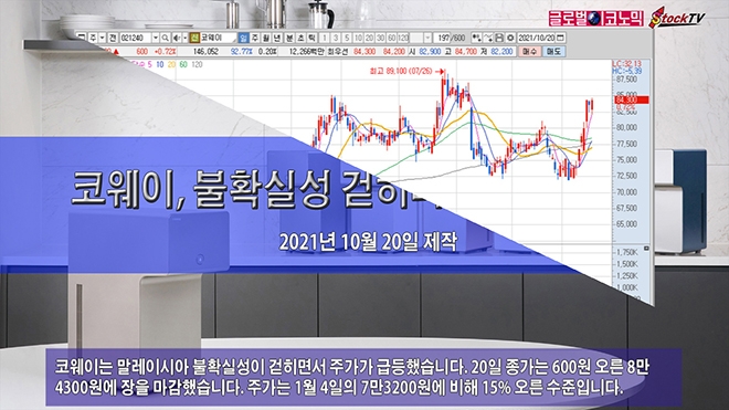 코웨이는 말레이시아 불확실성이 걷히면서 주가가 급등했습니다. 20일 종가는 600원 오른 8만4300원에 장을 마감했습니다. 주가는 1월 4일의 7만3200원에 비해 15% 오른 수준입니다.