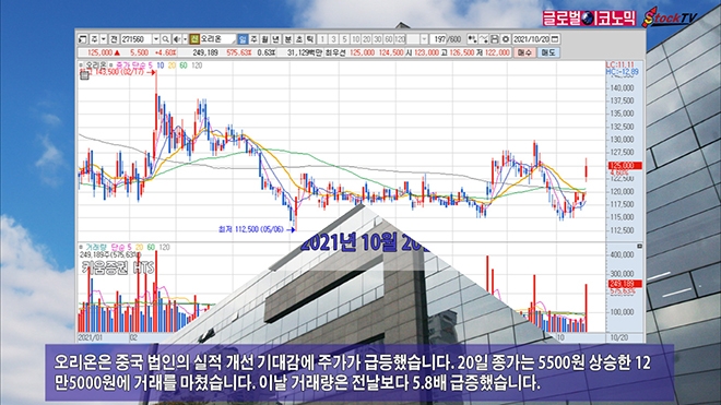 오리온은 중국 법인의 실적 개선 기대감에 주가가 급등했습니다. 20일 종가는 5500원 상승한 12만5000원에 거래를 마쳤습니다. 이날 거래량은 전날보다 5.8배 급증했습니다.