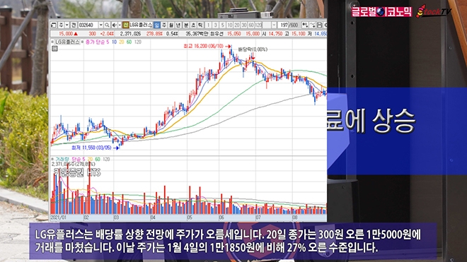 LG유플러스는 배당률 상향 전망에 주가가 오름세입니다. 20일 종가는 300원 오른 1만5000원에 거래를 마쳤습니다. 이날 주가는 1월 4일의 1만1850원에 비해 27% 오른 수준입니다.