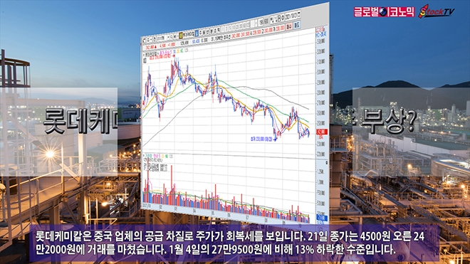 롯데케미칼은 중국 업체의 공급 차질로 주가가 회복세를 보입니다. 21일 종가는 4500원 오른 24만2000원에 거래를 마쳤습니다. 1월 4일의 27만9500원에 비해 13% 하락한 수준입니다.