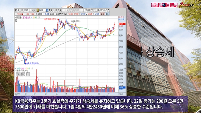KB금융지주는 3분기 호실적에 주가가 상승세를 유지하고 있습니다. 22일 종가는 200원 오른 5만7600원에 거래를 마쳤습니다. 1월 4일의 4만2450원에 비해 36% 상승한 수준입니다.
