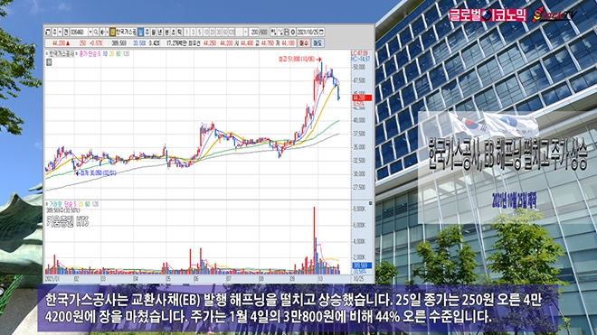 한국가스공사는 교환사채(EB) 발행 해프닝을 떨치고 상승했습니다. 25일 종가는 250원 오른 4만4200원에 장을 마쳤습니다. 주가는 1월 4일의 3만800원에 비해 44% 오른 수준입니다.