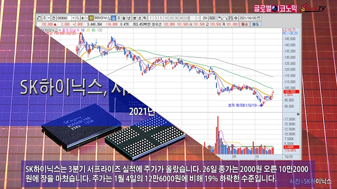 SK하이닉스는 3분기 서프라이즈 실적에 주가가 올랐습니다. 26일 종가는 2000원 오른 10만2000원에 장을 마쳤습니다. 주가는 1월 4일의 12만6000원에 비해 19% 하락한 수준입니다.