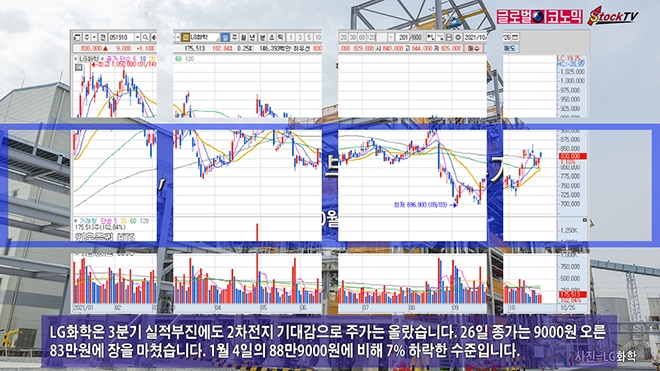 LG화학은 3분기 실적부진에도 2차전지 기대감으로 주가는 올랐습니다. 26일 종가는 9000원 오른 83만원에 장을 마쳤습니다. 1월 4일의 88만9000원에 비해 7% 하락한 수준입니다.