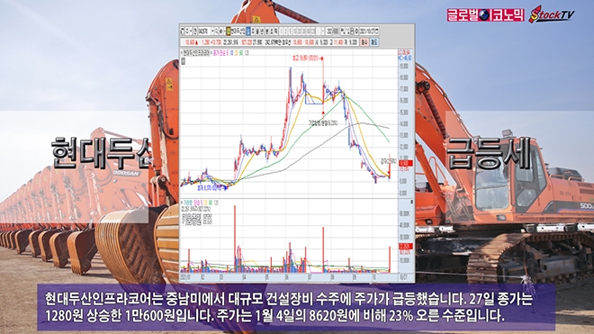 현대두산인프라코어는 중남미에서 대규모 건설장비 수주에 주가가 급등했습니다. 27일 종가는 1280원 상승한 1만600원입니다. 주가는 1월 4일의 8620원에 비해 23% 오른 수준입니다.