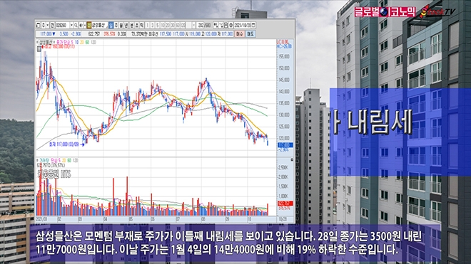 삼성믈산은 모멘텀 부재로 주가가 이틀째 내림세를 보이고 있습니다. 28일 종가는 3500원 내린 11만7000원입니다. 이날 주가는 1월 4일의 14만4000원에 비해 19% 하락한 수준입니다.