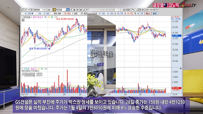 GS건설은 실적 부진에 주가가 박스권 장세를 보이고 있습니다. 28일 종가는 150원 내린 4만1250원에 장을 마쳤습니다. 주가는 1월 4일의 3만8050원에 비해 8% 상승한 수준입니다.