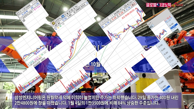 삼성엔지니어링은 원화약세 덕에 이익이 늘었지만 주가는 하락했습니다. 29일 종가는 400원 내린 2만4800원에 장을 마쳤습니다. 1월 4일의 1만3500원에 비해 84% 상승한 수준입니다.