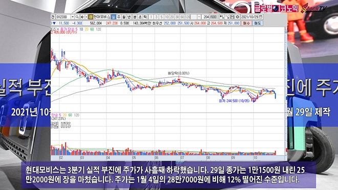 현대모비스는 3분기 실적 부진에 주가가 사흘째 하락했습니다. 29일 종가는 1만1500원 내린 25만2000원에 장을 마쳤습니다. 주가는 1월 4일의 28만7000원에 비해 12% 떨어진 수준입니다.