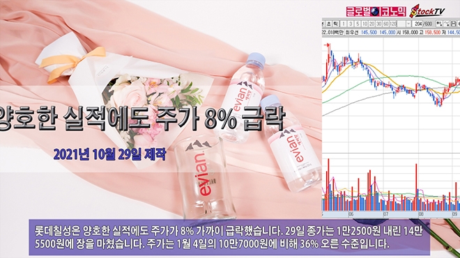 롯데칠성은 양호한 실적에도 주가가 8% 가까이 급락했습니다. 29일 종가는 1만2500원 내린 14만5500원에 장을 마쳤습니다. 주가는 1월 4일의 10만7000원에 비해 36% 오른 수준입니다.