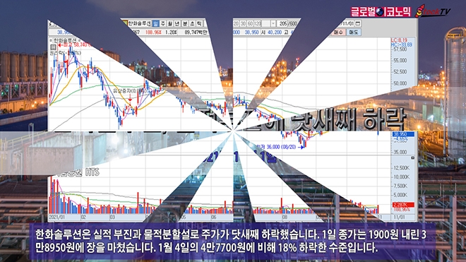 한화솔루션은 실적 부진과 물적분할설로 주가가 닷새째 하락했습니다. 1일 종가는 1900원 내린 3만8950원에 장을 마쳤습니다. 1월 4일의 4만7700원에 비해 18% 하락한 수준입니다.