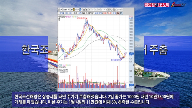 한국조선해양은 상승세를 타던 주가가 주춤해졌습니다. 2일 종가는 1000원 내린 10만3500원에 거래를 마쳤습니다. 이날 주가는 1월 4일의 11만원에 비해 6% 하락한 수준입니다.