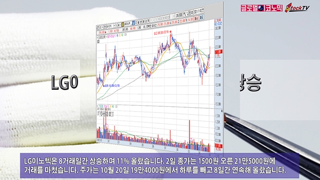 LG이노텍은 8거래일간 상승하며 11% 올랐습니다. 2일 종가는 1500원 오른 21만5000원에 거래를 마쳤습니다. 주가는 10월 20일 19만4000원에서 하루를 빼고 8일간 연속해 올랐습니다.
