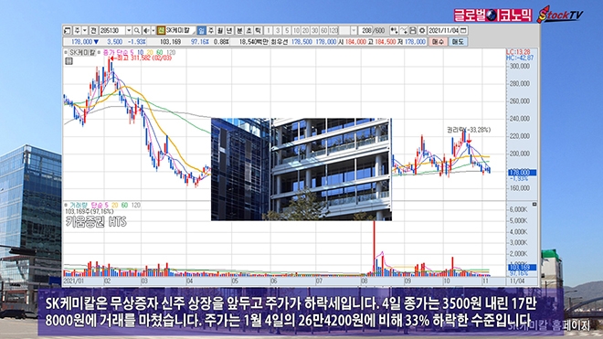 SK케미칼은 무상증자 신주 상장을 앞두고 주가가 하락세입니다. 4일 종가는 3500원 내린 17만8000원에 거래를 마쳤습니다. 주가는 1월 4일의 26만4200원에 비해 33% 하락한 수준입니다.