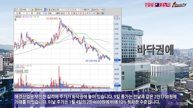 애경산업은 부진한 실적에 주가가 바닥권에 놓여 있습니다. 9일 종가는 전날과 같은 2만1700원에 거래를 마쳤습니다. 이날 주가는 1월 4일의 2만4600원에 비해 12% 하락한 수준입니다.