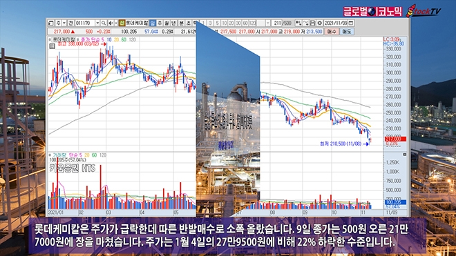 롯데케미칼은 주가가 급락한데 따른 반발매수로 소폭 올랐습니다. 9일 종가는 500원 오른 21만7000원에 장을 마쳤습니다. 주가는 1월 4일의 27만9500원에 비해 22% 하락한 수준입니다.