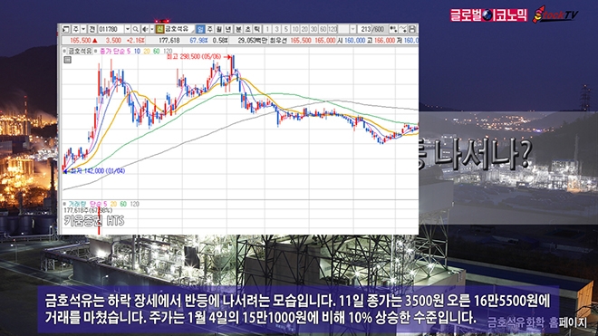 금호석유는 하락 장세에서 반등에 나서려는 모습입니다. 11일 종가는 3500원 오른 16만5500원에 거래를 마쳤습니다. 주가는 1월 4일의 15만1000원에 비해 10% 상승한 수준입니다.