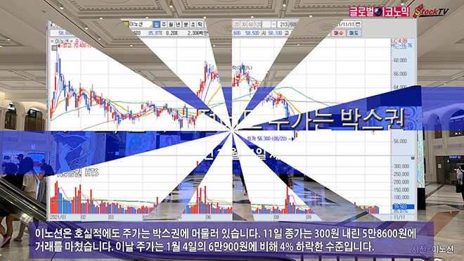 이노션은 호실적에도 주가는 박스권에 머물러 있습니다. 11일 종가는 300원 내린 5만8600원에 거래를 마쳤습니다. 이날 주가는 1월 4일의 6만900원에 비해 4% 하락한 수준입니다.