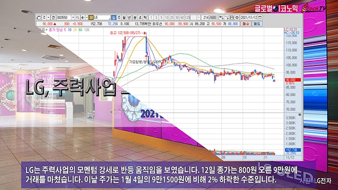 LG는 주력사업의 모멘텀 강세로 반등 움직임을 보였습니다. 12일 종가는 800원 오른 9만원에 거래를 마쳤습니다. 이날 주가는 1월 4일의 9만1500원에 비해 2% 하락한 수준입니다.