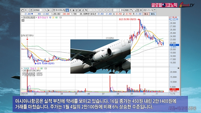 아시아나항공은 실적 부진에 약세를 보이고 있습니다. 16일 종가는 450원 내린 2만1400원에 거래를 마쳤습니다. 주가는 1월 4일의 2만100원에 비해 6% 상승한 수준입니다.