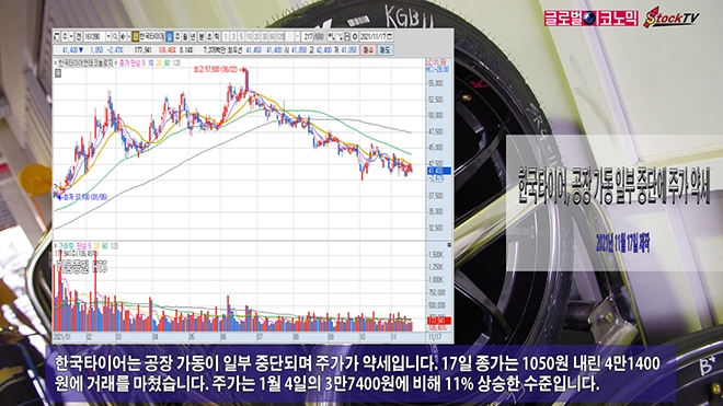 한국타이어는 공장 가동이 일부 중단되며 주가가 약세입니다. 17일 종가는 1050원 내린 4만1400원에 거래를 마쳤습니다. 주가는 1월 4일의 3만7400원에 비해 11% 상승한 수준입니다.