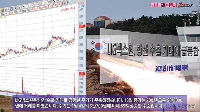 LIG넥스원은 방산 수출 기대로 급등한 주가가 주춤해졌습니다. 18일 종가는 200원 오른 5만8000원에 거래를 마쳤습니다. 주가는 1월 4일의 3만700원에 비해 89% 상승한 수준입니다.