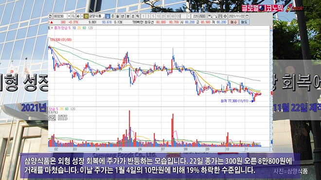 삼양식품은 외형 성장 회복에 주가가 반등하는 모습입니다. 22일 종가는 300원 오른 8만800원에 거래를 마쳤습니다. 이날 주가는 1월 4일의 10만원에 비해 19% 하락한 수준입니다.