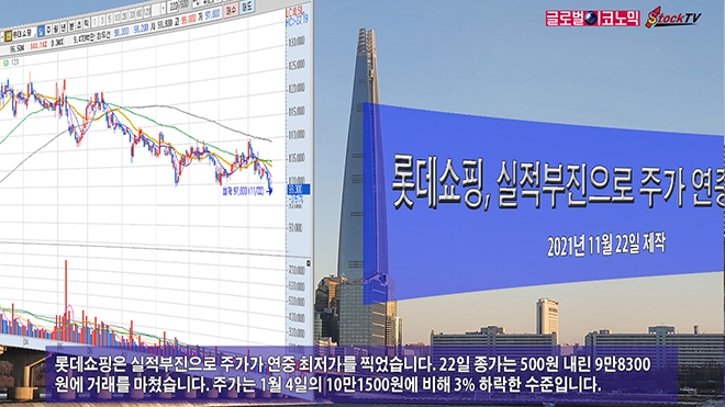 롯데쇼핑은 실적부진으로 주가가 연중 최저가를 찍었습니다. 22일 종가는 500원 내린 9만8300원에 거래를 마쳤습니다. 주가는 1월 4일의 10만1500원에 비해 3% 하락한 수준입니다.