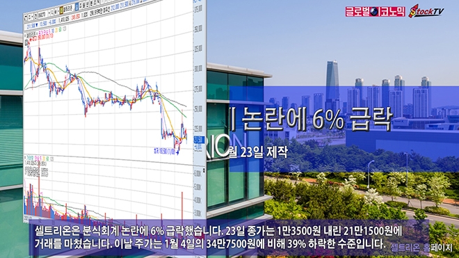 셀트리온은 분식회계 논란에 6% 급락했습니다. 23일 종가는 1만3500원 내린 21만1500원에 거래를 마쳤습니다. 이날 주가는 1월 4일의 34만7500원에 비해 39% 하락한 수준입니다.