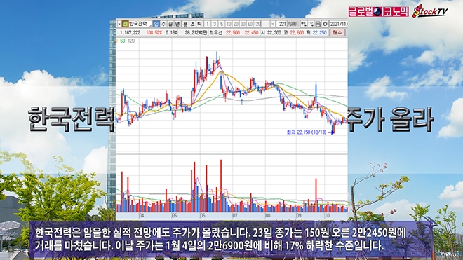 한국전력은 암울한 실적 전망에도 주가가 올랐습니다. 23일 종가는 150원 오른 2만2450원에 거래를 마쳤습니다. 이날 주가는 1월 4일의 2만6900원에 비해 17% 하락한 수준입니다.