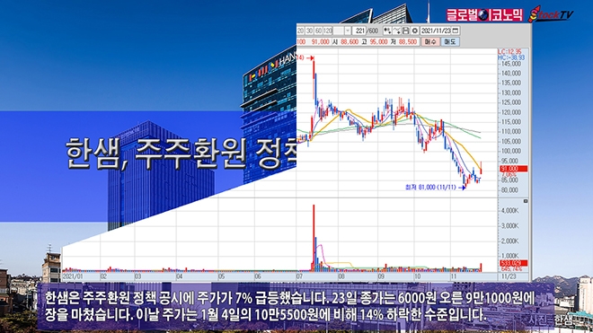 한샘은 주주환원 정책 공시에 주가가 7% 급등했습니다. 23일 종가는 6000원 오른 9만1000원에 장을 마쳤습니다. 이날 주가는 1월 4일의 10만5500원에 비해 14% 하락한 수준입니다.