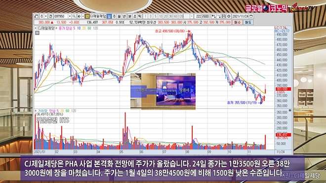 CJ제일제당은 PHA 사업 본격화 전망에 주가가 올랐습니다. 24일 종가는 1만3500원 오른 38만3000원에 장을 마쳤습니다. 주가는 1월 4일의 38만4500원에 비해 1500원 낮은 수준입니다.