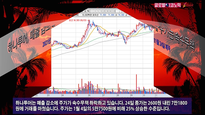 하나투어는 매출 감소에 주가가 속수무책 하락하고 있습니다. 24일 종가는 2600원 내린 7만1800원에 거래를 마쳤습니다. 주가는 1월 4일의 5만7500원에 비해 25% 상승한 수준입니다.