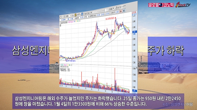 삼성엔지니어링은 해외 수주가 늘었지만 주가는 하락했습니다. 25일 종가는 950원 내린 2만2450원에 장을 마쳤습니다. 1월 4일의 1만3500원에 비해 66% 상승한 수준입니다.
