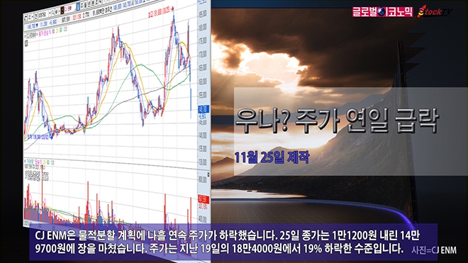 CJ ENM은 물적분할 계획에 나흘 연속 주가가 하락했습니다. 25일 종가는 1만1200원 내린 14만9700원에 장을 마쳤습니다. 주가는 지난 19일의 18만4000원에서 19% 하락한 수준입니다.