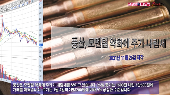 풍산은 모멘텀 약화에 주가가 내림세를 보이고 있습니다. 26일 종가는 1600원 내린 3만600원에 거래를 마쳤습니다. 주가는 1월 4일의 2만8200원에 비해 9% 상승한 수준입니다.