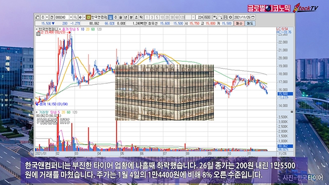 한국앤컴퍼니는 부진한 타이어 업황에 나흘째 하락했습니다. 26일 종가는 200원 내린 1만5500원에 거래를 마쳤습니다. 주가는 1월 4일의 1만4400원에 비해 8% 오른 수준입니다.