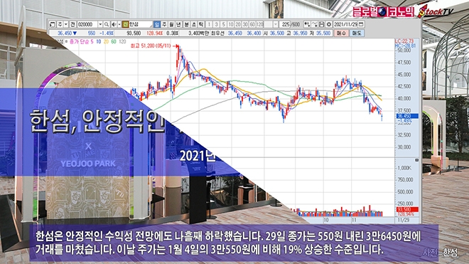 한섬은 안정적인 수익성 전망에도 나흘째 하락했습니다. 29일 종가는 550원 내린 3만6450원에 거래를 마쳤습니다. 이날 주가는 1월 4일의 3만550원에 비해 19% 상승한 수준입니다.