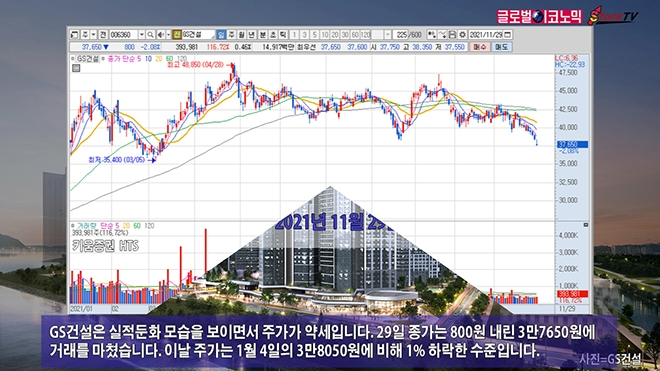 GS건설은 실적둔화 모습을 보이면서 주가가 약세입니다. 29일 종가는 800원 내린 3만7650원에 거래를 마쳤습니다. 이날 주가는 1월 4일의 3만8050원에 비해 1% 하락한 수준입니다.