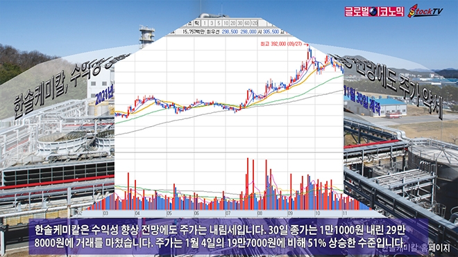 한솔케미칼은 수익성 향상 전망에도 주가는 내림세입니다. 30일 종가는 1만1000원 내린 29만8000원에 거래를 마쳤습니다. 주가는 1월 4일의 19만7000원에 비해 51% 상승한 수준입니다.
