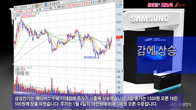 삼성전기는 메타버스 수혜 기대감에 주가가 사흘째 상승했습니다. 7일 종가는 1500원 오른 18만500원에 장을 마쳤습니다. 주가는 1월 4일의 18만원에 비해 500원 오른 수준입니다.