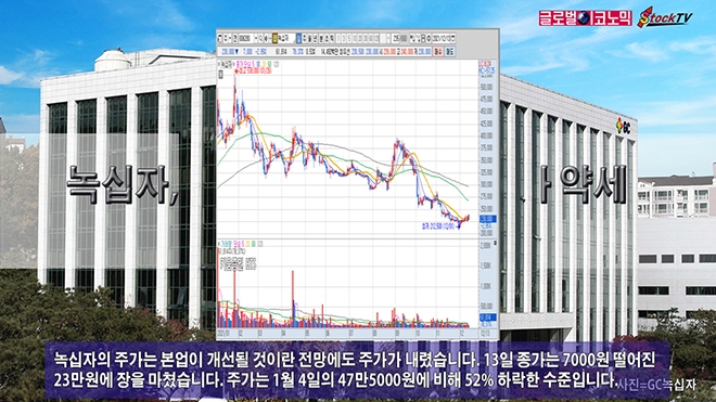 녹십자의 주가는 본업이 개선될 것이란 전망에도 주가가 내렸습니다. 13일 종가는 7000원 떨어진 23만원에 장을 마쳤습니다. 주가는 1월 4일의 47만5000원에 비해 52% 하락한 수준입니다.