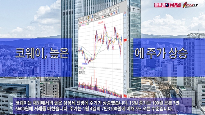 코웨이는 해외에서의 높은 성장세 전망에 주가가 상승했습니다. 13일 종가는 100원 오른 7만6600원에 거래를 마쳤습니다. 주가는 1월 4일의 7만3200원에 비해 5% 오른 수준입니다.