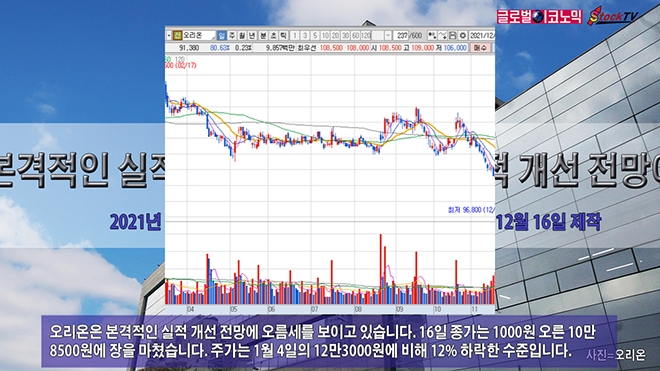 오리온은 본격적인 실적 개선 전망에 오름세를 보이고 있습니다. 16일 종가는 1000원 오른 10만8500원에 장을 마쳤습니다. 주가는 1월 4일의 12만3000원에 비해 12% 하락한 수준입니다.