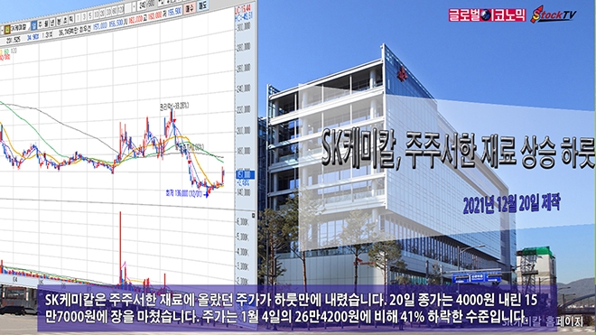 SK케미칼은 주주서한 재료에 올랐던 주가가 하룻만에 내렸습니다. 20일 종가는 4000원 내린 15만7000원에 장을 마쳤습니다. 주가는 1월 4일의 26만4200원에 비해 41% 하락한 수준입니다.