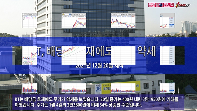 KT는 배당금 호재에도 주가가 약세를 보였습니다. 20일 종가는 400원 내린 3만1950원에 거래를 마쳤습니다. 주가는 1월 4일의 2만3800원에 비해 34% 상승한 수준입니다.
