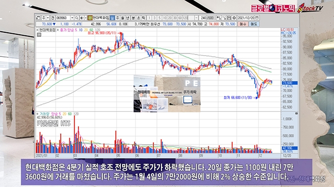 현대백화점은 4분기 실적 호조 전망에도 주가가 하락했습니다. 20일 종가는 1100원 내린 7만3600원에 거래를 마쳤습니다. 주가는 1월 4일의 7만2000원에 비해 2% 상승한 수준입니다.