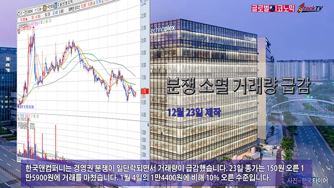 한국앤컴퍼니는 경영권 분쟁이 일단락되면서 거래량이 급감했습니다. 23일 종가는 150원 오른 1만5900원에 거래를 마쳤습니다. 1월 4일의 1만4400원에 비해 10% 오른 수준입니다.