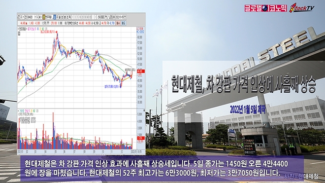 현대제철은 차 강판 가격 인상 효과에 사흘째 상승세입니다. 5일 종가는 1450원 오른 4만4400원에 장을 마쳤습니다. 현대제철의 52주 최고가는 6만3000원, 최저가는 3만7050원입니다.
